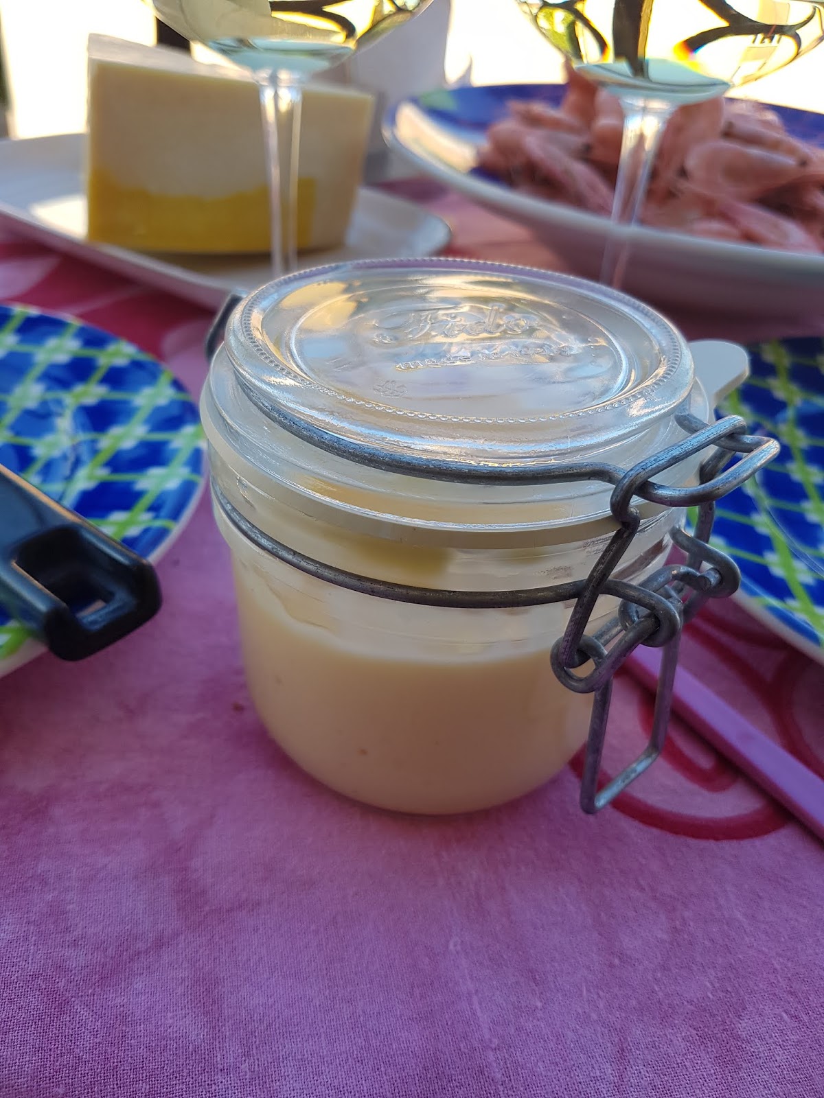 Den 5 juli åt vi räkor, hemgjord majo och hembakt bröd på balkongen. Till räkorna en sval 2016 Penfolds Reserve Bin 16A.